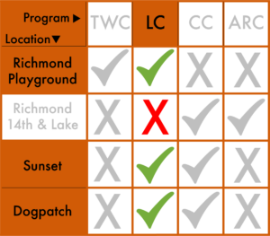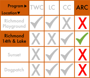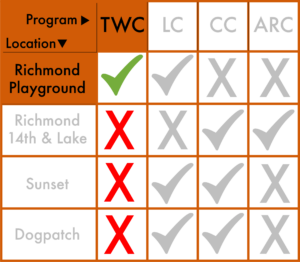 Camp SessionsSession 1: June 8 – 12 Session 2: June 15 – 19 Session 3 – June 22 – 26: Girls+ Week Session 4 – June 29 – July 2: NO CAMP JULY 3rd, NO TWC Session 5: July 6 – 10 Session 6: July 13 – 17 Session 7: July 20 – 25 Session 8: July 27 – 31 Session 9: August 3 – 7; Girls+ Week Session 10: August 10 – 14 Session 11: August 17 – 21; NO ARC Session 12 – August 24 – 28; NO ARC; ALL CAMPS AT RICHMOND PLAYGROUND |