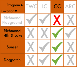 Camp Cruisin’ is offered at our Richmond District, Sunset, or Dogpatch locations